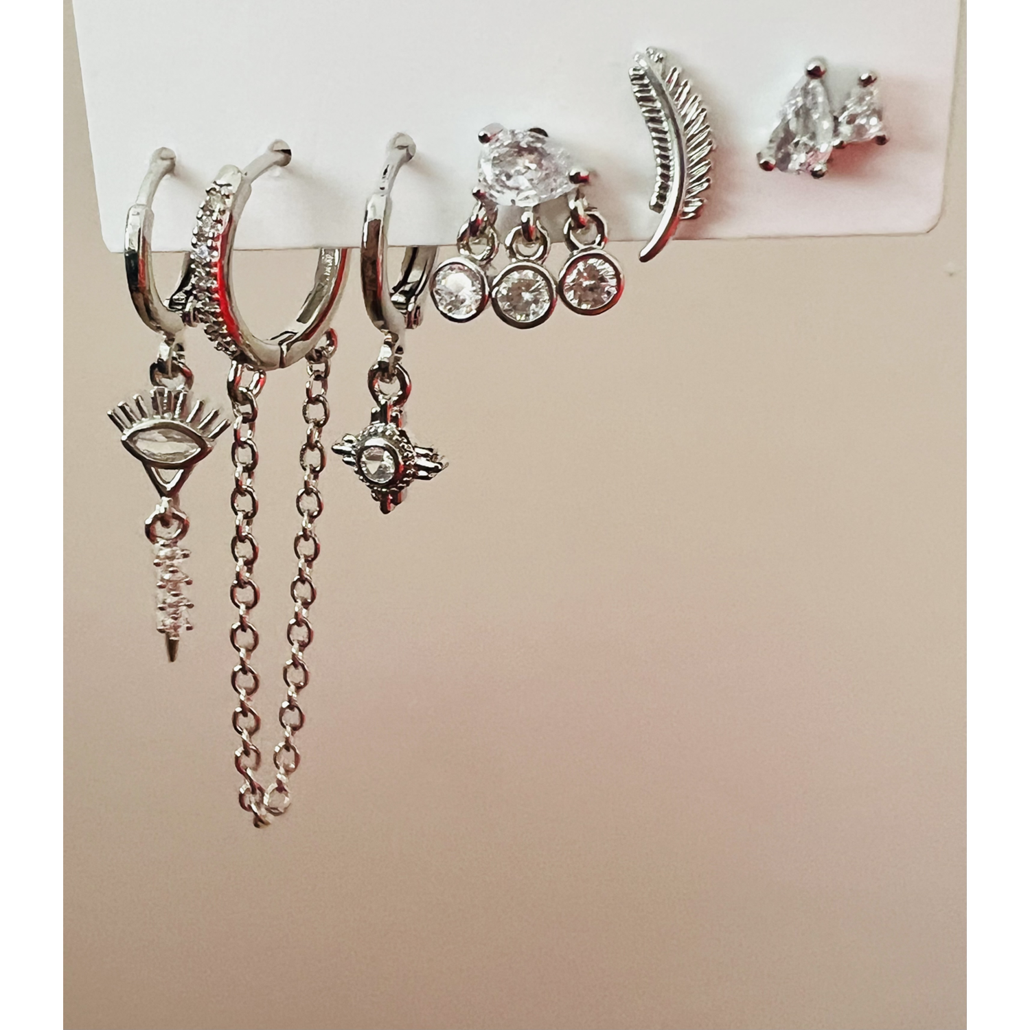 6'LI GÖZ DETAYLI, ZİNCİR SALLANTILI, YAPRAKLI KÜPE SETİ-GÜMÜŞ RENK ACR8996