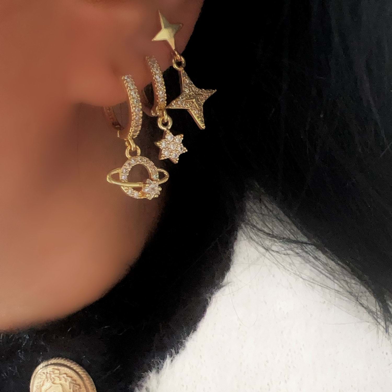 ÜÇLÜ GEZEGEN-YILDIZ DETAYLI KÜPE SETİ-GOLD RENK ACR9454