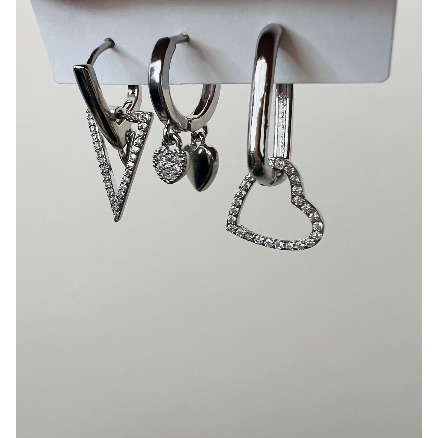 ÜÇLÜ TAŞLI ÜÇGEN-KALPLİ KÜPE SETİ-GÜMÜŞ RENK ACR9350
